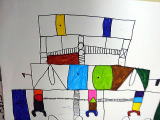 1回目は絵の基本、マス目を生かし形を描きます。自分の描きたい物をパズルのように組み合わせて